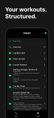 Organizirajte svoj režim treninga s neviđenom fleksibilnošću. Setgraph vam omogućuje grupiranje vježbi u prilagođene popise prema mišićnoj skupini, programu, danu u tjednu ili bilo kojem drugom kriteriju koji vam odgovara. Dodajte detaljne bilješke uz svaku vježbu ili popis, opisujući ciljeve, strategije ili upute za savršenu izvedbu. Jedna vježba može se nalaziti na više popisa, pružajući vam potpuni uvid u njezinu povijest i performanse iz različitih perspektiva, dok prilagodljivo sortiranje osigurava da su vaše vježbe uvijek prikazane upravo onako kako želite.